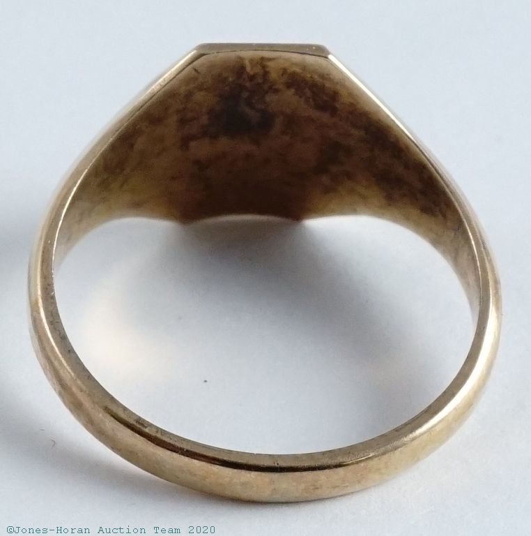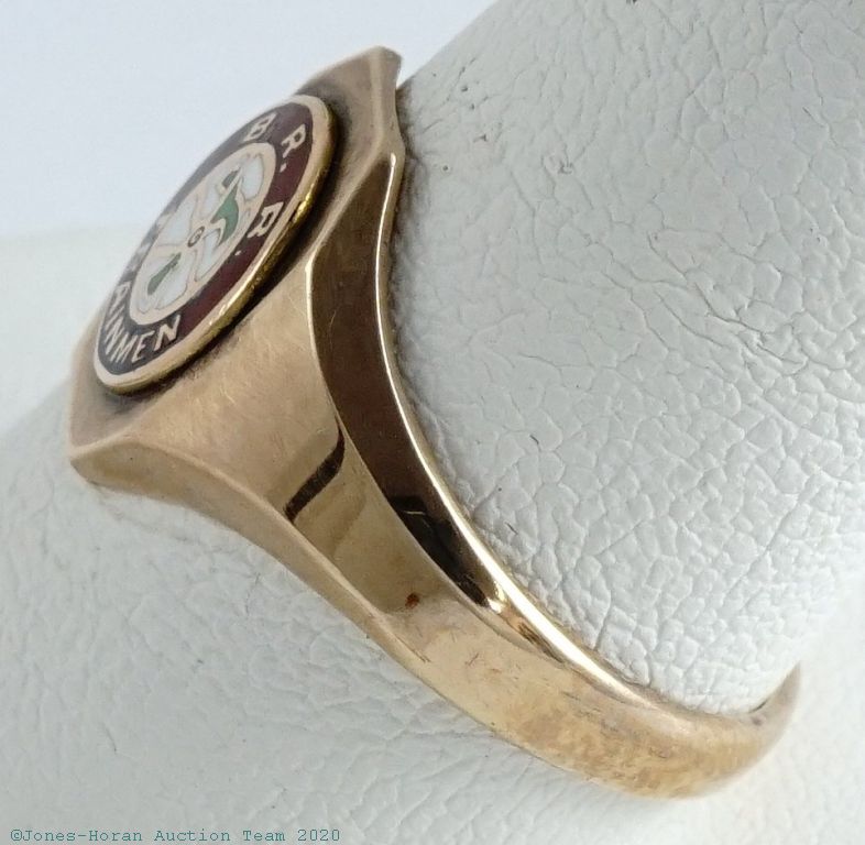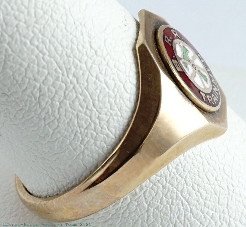 Brotherhood of Railroad Trainmen (B of RT) signet ring in 10K gold with red, white and green enamel accents, size 9.5, truly a must have for the railroad watch collector, especially for those interested in Brotherhood signed watches. Gross weight 3.2 dwt (5.0 g).