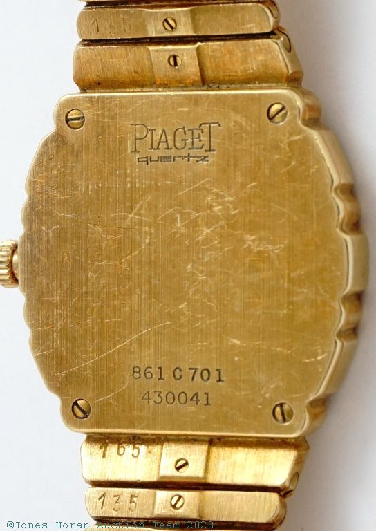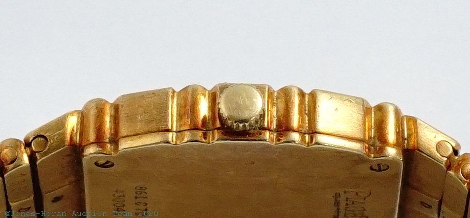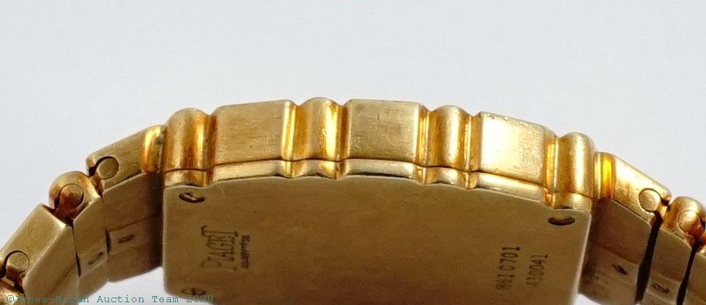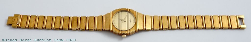 LWW - Piaget, quartz, 23mm x 22mm to lug tips, original 18K yellow gold screw back case with an integrated 18K yellow gold bracelet with fold over clasp, original textured champagne dial to match the design of the case, 10J cal 8P1, s#430041, triple signed. Gross weight of assembled watch 58.3 dwt (90.4 g).