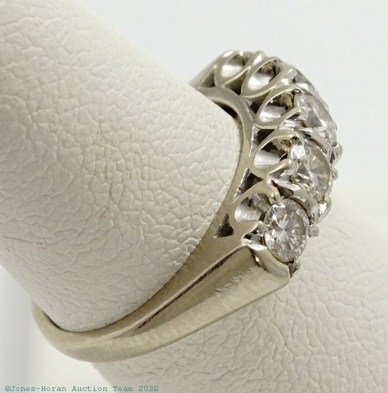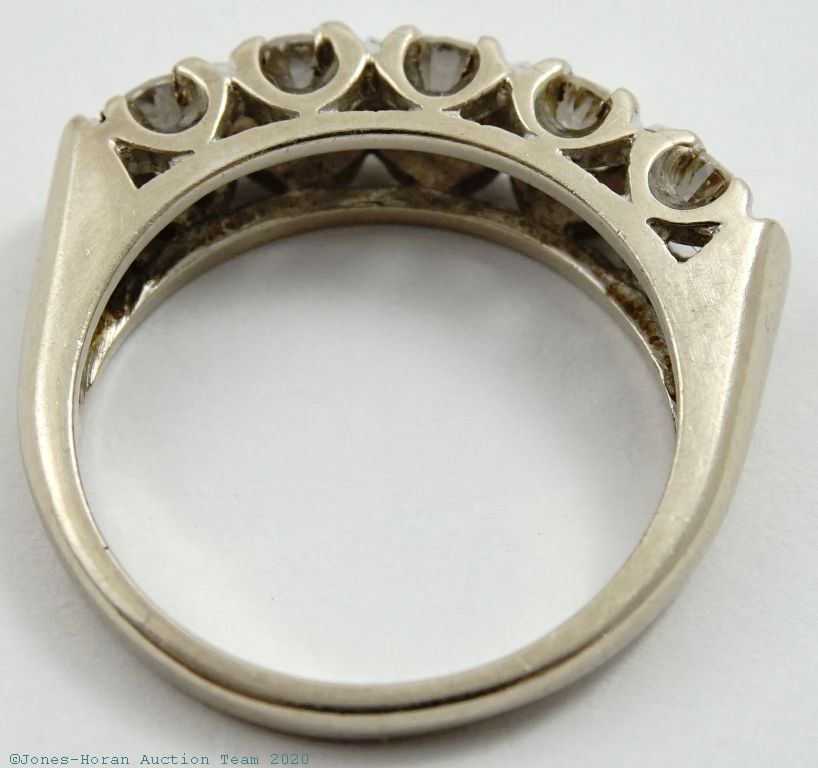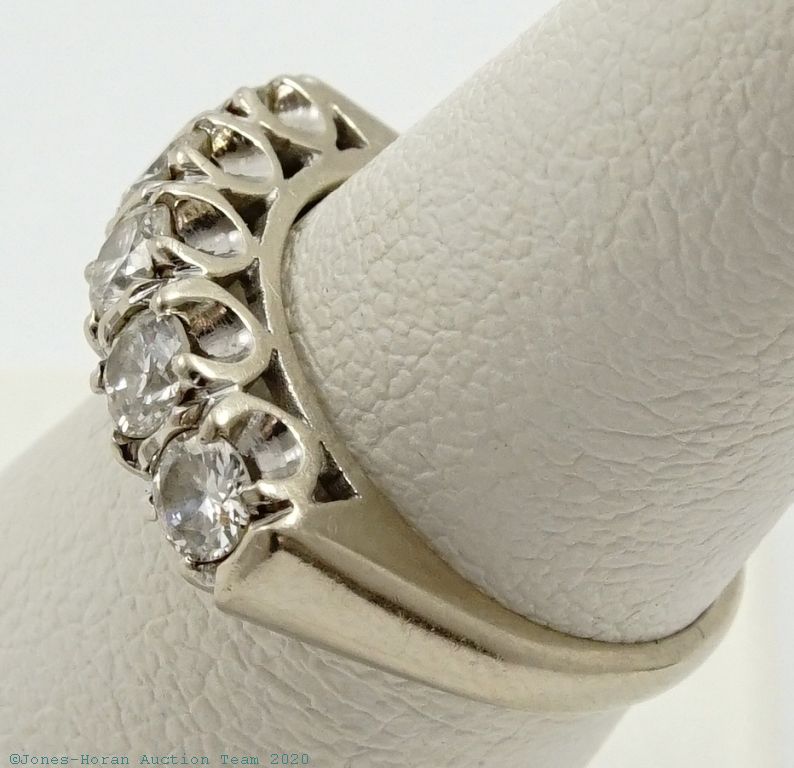 Diamond and 14K white gold band, 5 round brilliant cut diamonds weigh approximately 1.30 ctw, size 6.5, a fabulous ring with very nice quality diamonds of clear appearance and white color, would go nicely with a larger engagement ring of over 1 ct or worn by itself. Gross weight 2.6 dwt (4.0 g).