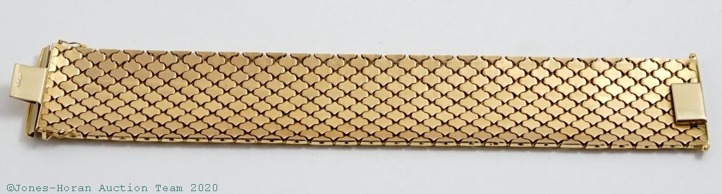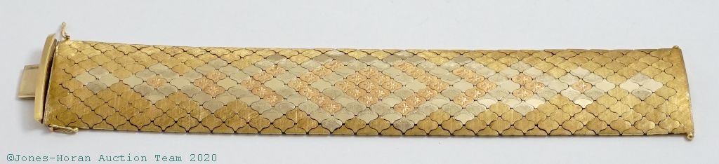 18K white, rose and yellow gold extra wide textured bracelet with box clasp and double safety 8's, bracelet measures 32mm wide and 7.75 inches in overall length, hallmarks from Vicenza, Italy; a fabulously heavy piece with an incredible weight excellent for the gold lover or the person who just likes exquisite craftsmanship. Gross weight 63.9 dwt (99.6 g).