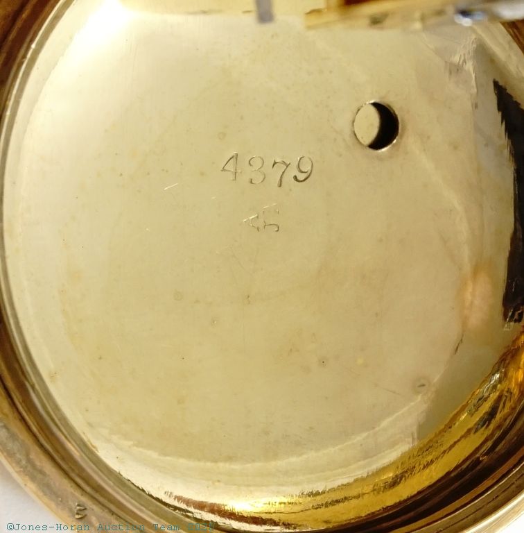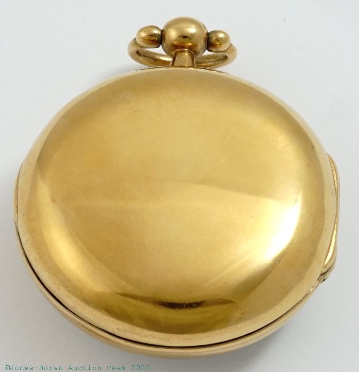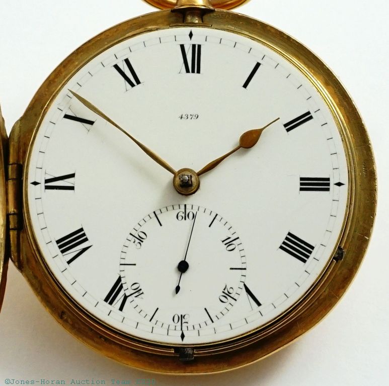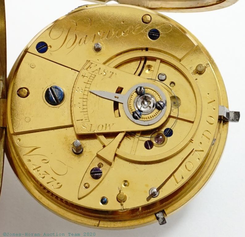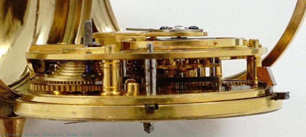 EPW - Barwise, London, duplex fusee with hacking function, 52mm, gilt OF original consular case with incuse "A G J M" marking for casemaker Ann Grove and James Melvill, off white enamel dial, hacking slide under dial at 4, KWKS, duplex escapement with capped escape wheel, diamond endstone, likely 8J, gilt four arm balance wheel, gilt mvt, s#4379 with matching serial number to dial and within case. The balance stop arm of this example is unusual, being located on the top plate.