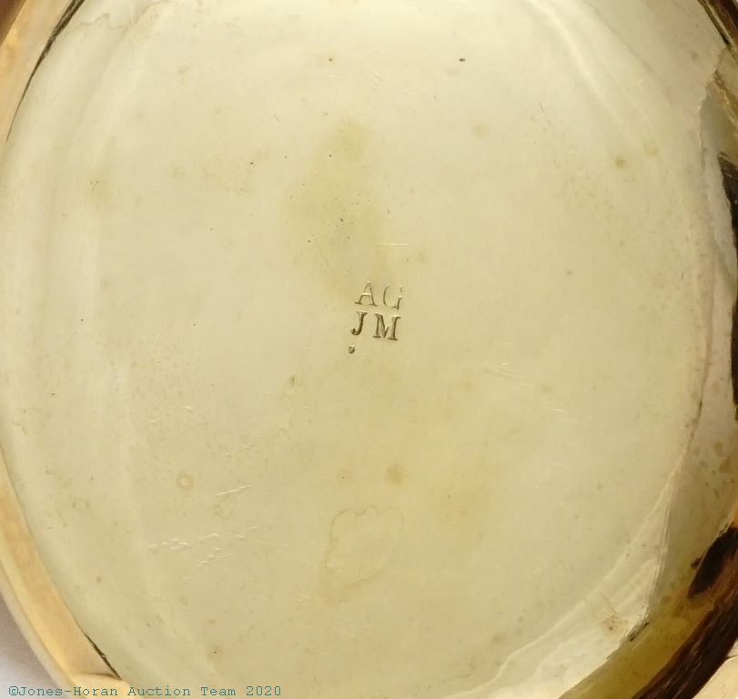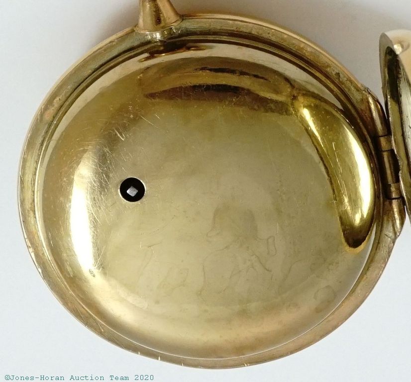 Mvt: Running, good hacking function, fine-plus cosmetic mvt condition overall, scattered fine to micro-fine scratches; dial with perimeter hl from 3 to 5:30 and perimeter hl from 5:30 to 7; excellent hands; case has been re-gilt and shows light wear, some small nicks, no dents; good domed glass crystal with few very small fine scratches, finish imperfection over lower portion of seconds-register.