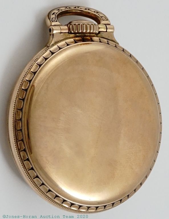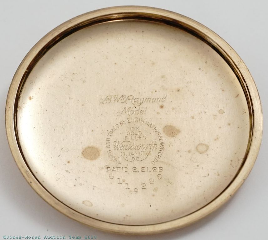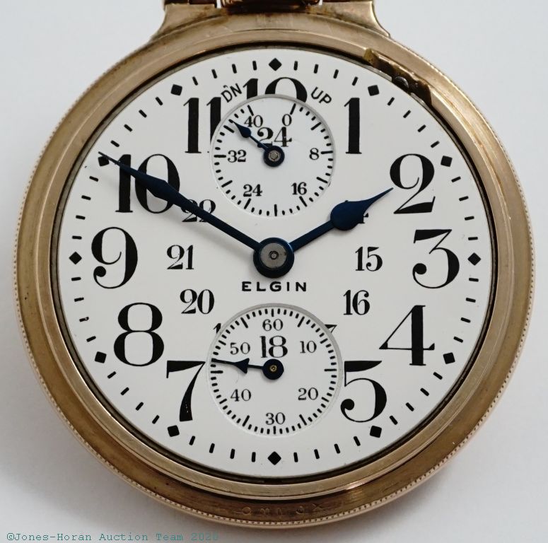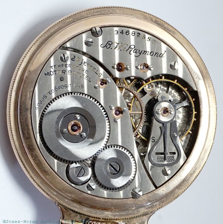 APW - Elgin, B.W. Raymond with winding indicator, Grade 494, 23J, 16S, rose gold-filled OF original B.W. Raymond Model case with elegant black enamel inlay to bezel, rear perimeter and bow, white enamel DS dial with Canadian market 13 to 24 hour indications, SW-LS, fully capped lever escapement, jeweled barrel arbor, striped pattern nickel damascene, s#34682553. An excellent example of this high grade railroad watch with a very attractive combination of 24 hour dial and rose colored case with enamel inlay, the total production of the Grade 494 was 5000 made with all examples having winding indicator feature.