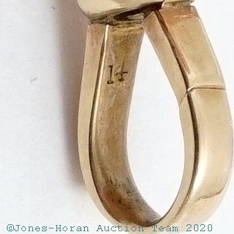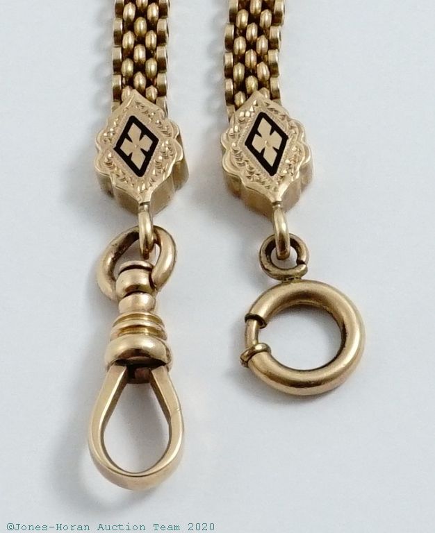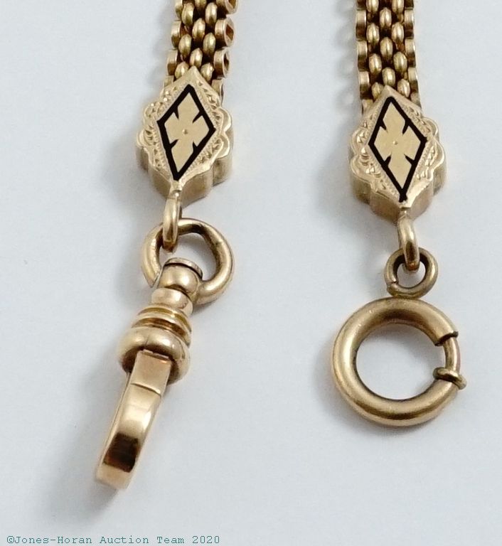 14K gold watch chain with decorative elements at each end having black tracery enamel inlay, all components 14K gold with the exception of a gold-filled spring-ring at terminal, chain measures 18.5 inches from clasp to spring-ring. Gross weight 16.5 dwt (25.7 g).