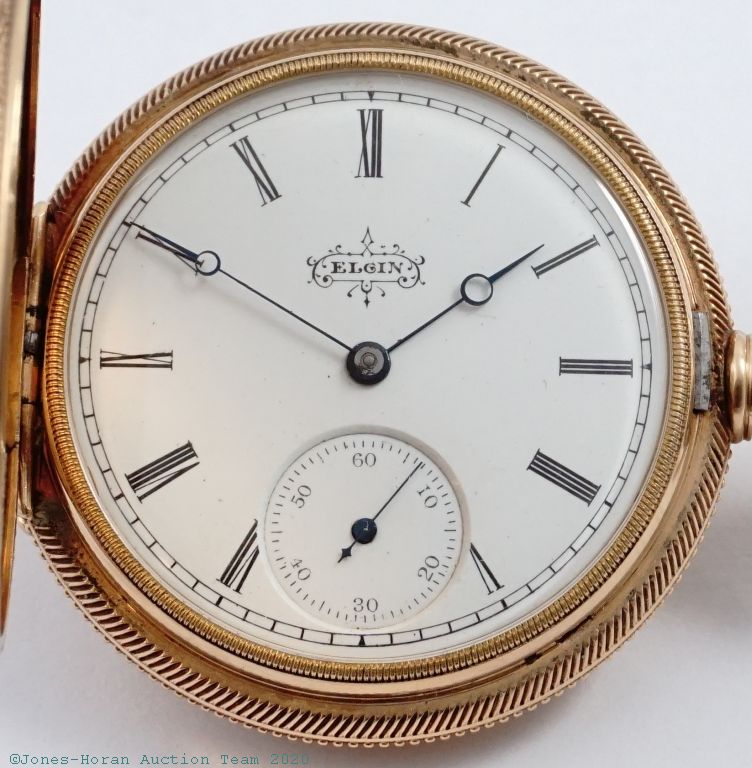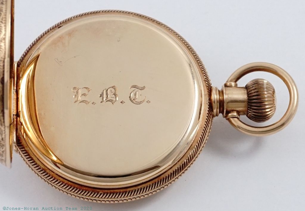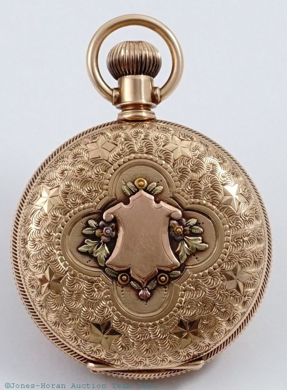 LPW - Elgin, 15J, 6S, 14K multicolor gold "K U" (Keller and Untermeyer) HC recase with multicolor rosette to rear with inset diamond at center, rose gold shield to front with multicolor floral surround, gold cuvette with engraved initials, white enamel SS dial, SW-SS, nickel damascene, s#5351381. Gross weight of assembled watch 38.2 dwt (59.5 g).