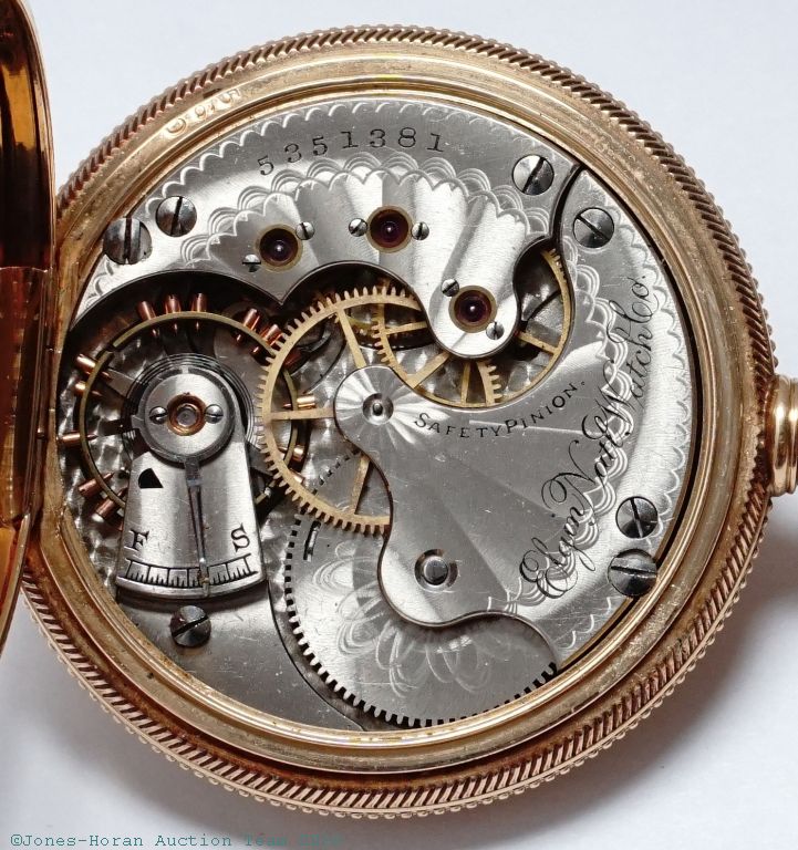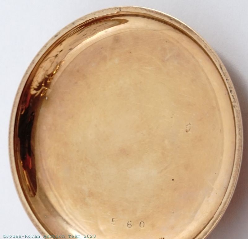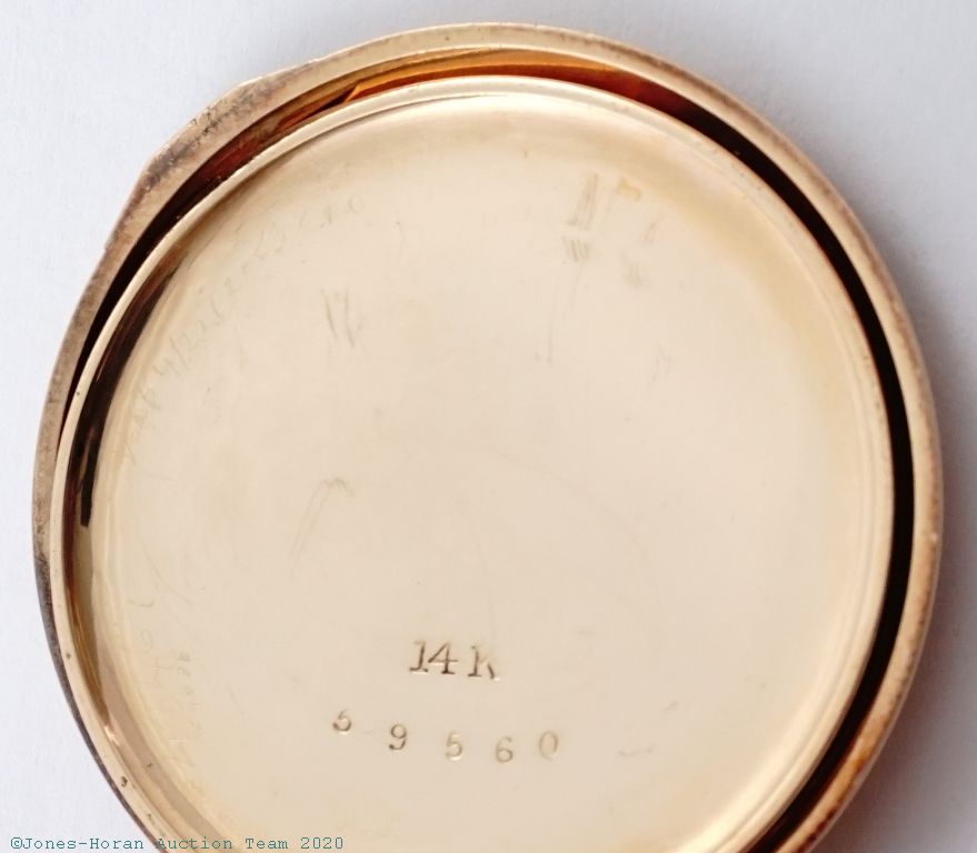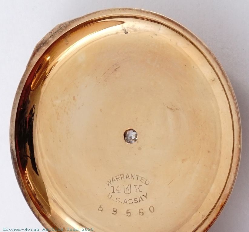 Mvt: NR, fully wound, balance is gummy, overhaul needed, excellent-plus cosmetic mvt condition overall, scattered micro-fine scratches; dial flawless in visible portion; excellent hands, oxide to center hub of minute; case shows hardly any wear, ding to lower center of front below shield, excellent engraving detail; tight bow, crown shows light wear; clean plastic crystal.