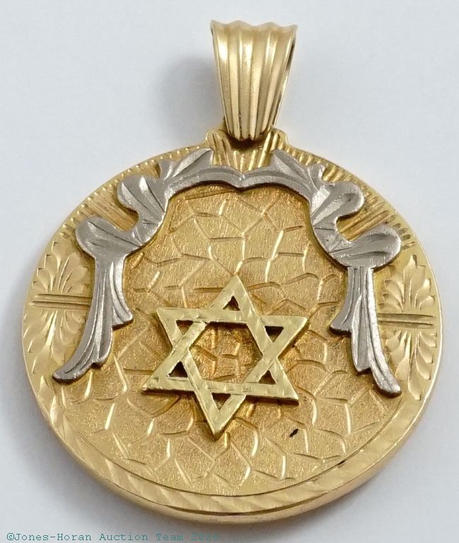 18K white and yellow gold custom made Saint Christopher medallion with raised star of David on rear, pendant measures 39mm x 49mm to top of bail, truly a piece to behold with incredible weight and presence. Gross weight 30.0 dwt (46.7 g).
