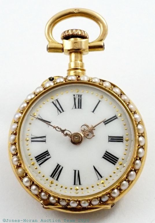 LPW - LeCoultre (unsigned, our attribution), Swiss, miniature ladies' pendant watch, 22mm, 18K gold OF original case with beautiful polychrome enamel portrait of a lady, seed pearls set to bezel and rear perimeter, inner rear with "M G" marking within diamonds for Marcelin Grisel, gold cuvette, fancy white enamel dial with gold foil minute markers, fancy gilt Louis XV style hands, SW-pin-set, cylinder escapement, 12J, fausses-cĂ´tes pattern nickel damascene, s#26600 within case. In need of overhaul for movement function, but a particularly beautiful miniature watch of notably small size and with attractive enameled portrait and deep engraving detail.