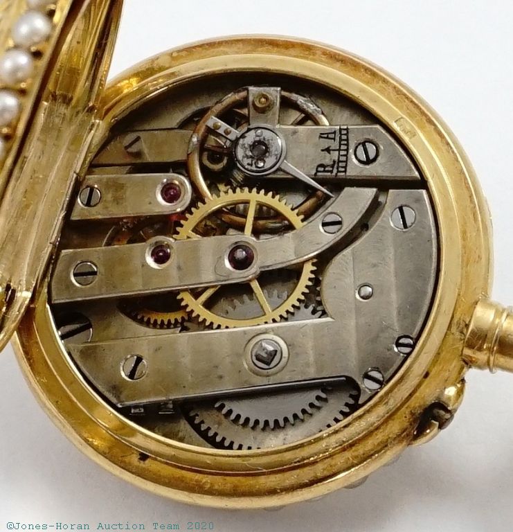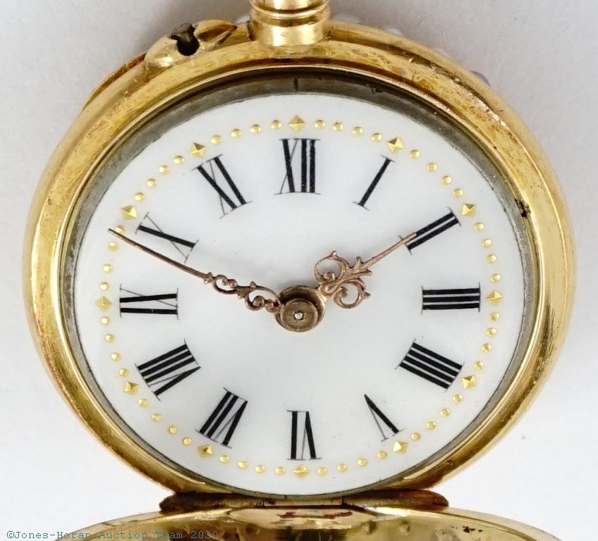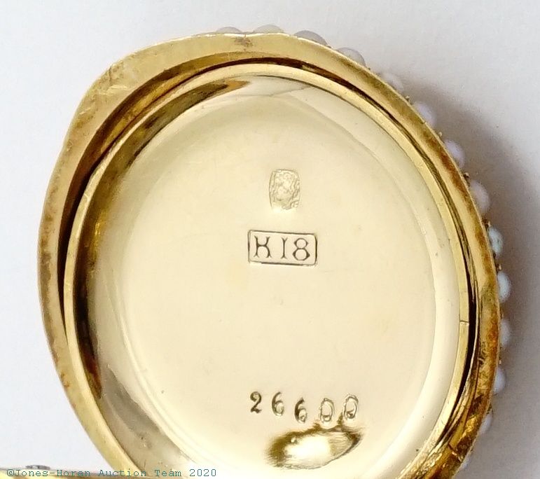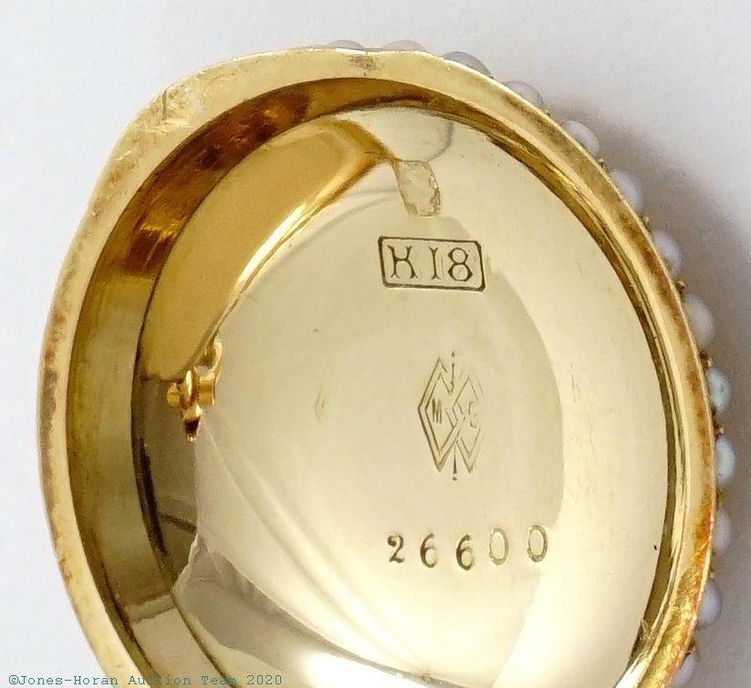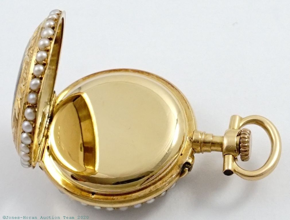 Mvt: NR, can be prodded to tick in dial down position but is stopping consistently when turned dial up, balance wheel with lead solder at areas of perimeter, overhaul needed, fine cosmetic mvt condition overall, oxide to balance jewel cap, some toning of plate surfaces; flawless dial; excellent hands; case shows hardly any wear, no dents or dings, superb engraving detail, enamel portrait is intact with typical scattered surface scratches, seed pearls are fully present; tight bow, crown shows light wear; glass crystal with scratch above center and scratch at upper perimeter.