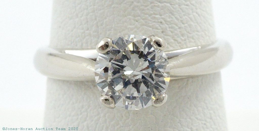 Diamond and 14K white gold engagement ring, round brilliant cut diamond weighs 1.08 ct, very clean diamond except for a feather in the middle of the table, two round brilliant cut diamonds set on the side of the mounting weigh approximately 0.02 ctw, size 6.5. Includes a grading report from a GIA Diamond's graduate with an estimated value of $5,940 as well as an estimated K color and SI3 clarity. Gross weight 2.4 dwt (3.8 g).