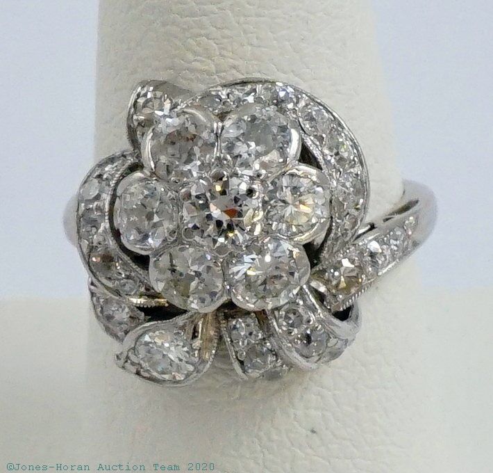 Diamond and platinum vintage cluster style floral cocktail ring; 6 center diamonds including 1 round brilliant cut, 4 mine cuts and 1 European cut diamond that weigh approximately 1.40 ctw; 24 single cut, round full cut and mine cut diamonds weigh 0.60 ctw, combined diamonds have an approximate weight of 2.0 ctw, size 6. Gross weight 4.8 dwt (7.7 g). An exquisite ring sure to put a smile on the face of whoever wears it.