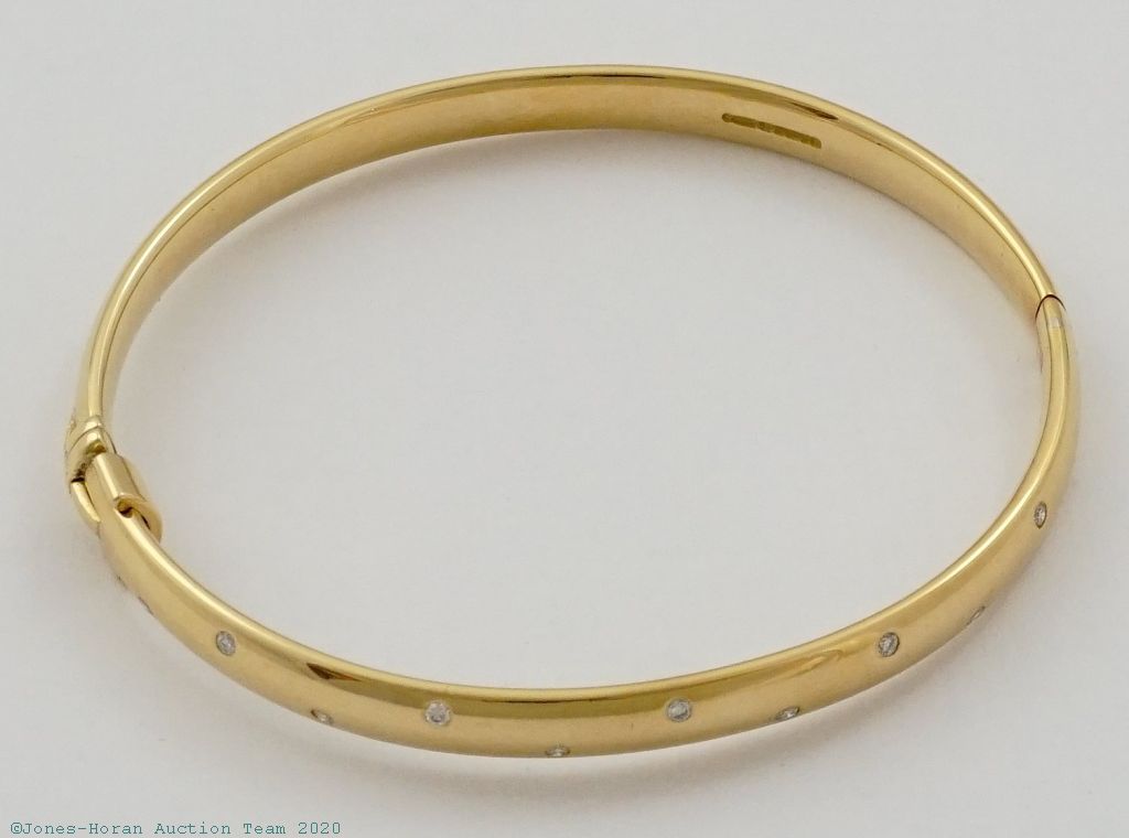 Diamond and 18K yellow gold bangle bracelet with fold over safety clasp, 11 round brilliant cut diamonds weigh approximately 0.11 ctw, bangle inside dimensions 60mm x 53mm, bangle outside dimensions 67mm x 58mm. A wonderfully heavy bangle bracelet made of solid materials giving it a very weighty feel, includes a yellow travel pouch. Gross weight of bracelet 22.9 dwt (35.7 g).