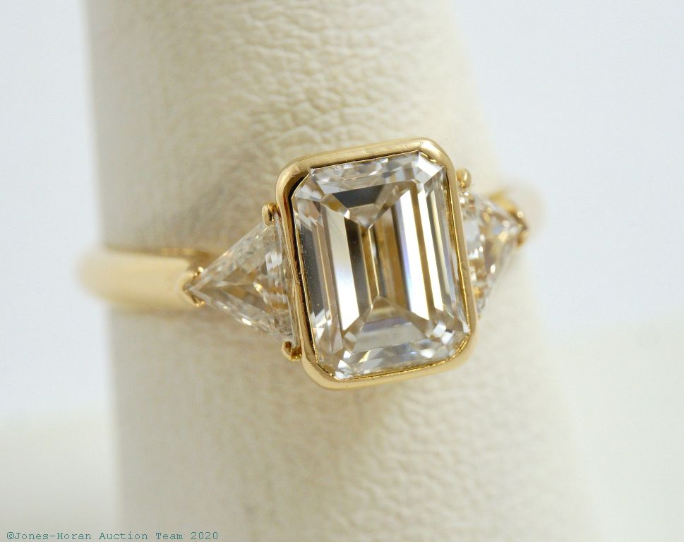 Diamond and 18K yellow gold engagement ring by Boucheron of Paris, emerald cut center diamond weighs approximately 1.85 ct, J color or better and VS2 clarity, color is very hard to determine in the yellow gold mounting, 2 triangle cut diamonds weigh approximately 0.60 ctw, G color or better, size 6.25. Truly an exquisite ring with a fabulous center stone the likes of which will make any woman say YES (within reason of course). Includes a recent jeweler's appraisal with an estimated total value of $14,710. Gross weight 2.4 dwt (3.8 g).