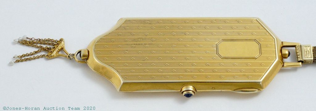 14K yellow gold, sapphire and seed pearl Art Deco compact with beautifully engraved detail and unmonogrammed crest, adjustable mesh bracelet, compact measures 33mm x 87mm not including briolette dangle and mesh bracelet top, inside is a small mirror and two hinged compartments, one for rouge with loose powder puff, mesh bracelet measures 5 inches, truly an exquisite piece from a bygone era of luxury. Gross weight 40.5 dwt (63.1 g).
