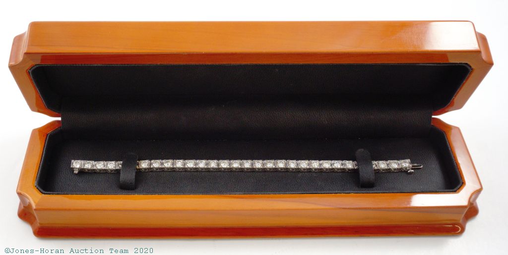 Diamond and 18K white gold Art Deco bracelet, 30 round full cut diamonds weigh approximately 10.9 ctw, bracelet measures 7.25 inches in length, truly an exquisite piece with incredible presence on the wrist sure to make anyone feel like a princess. Includes a wooden presentation box as well as an outer carboard box. Gross weight of bracelet 17.4 dwt (27.2 g).