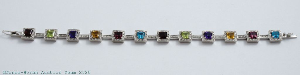 18K white gold, diamond and gemstone bracelet with safety 8, numerous square step cut stones including garnet, citrine, peridot, topaz, amethyst and more, bracelet measures 7 inches in length, a lovely bracelet for the person who loves a little flair of color in their jewelry. Gross weight 17.9 dwt (27.8 g).