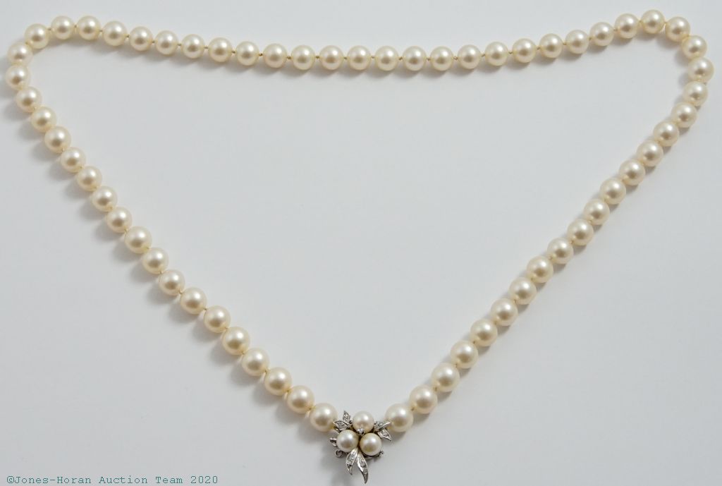 Akoya saltwater pearl double knotted necklace with diamond, pearl and 14K white gold clasp, pearls with excellent luster and very good matching, AA quality or better, almost completely round with almost no surface marks, pearls measure approximately 8.5mm round, strand measures 26 inches long. Truly a timeless classic that adds a level of dignity to whoever wears them.