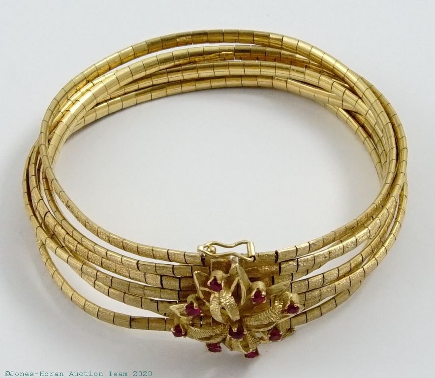 Ruby and 18K yellow gold florally designed 7-strand bracelet with hidden clasp and double safety 8's, 9 round full cut rubies weigh approximately 0.54 ctw, bracelet measures 7.25 inches in length, an exquisite bracelet of undeniably fine construction with polished inner links to add to comfortability, this would make an excellent gift or a perfect centerpiece for a reseller's showcase. Hallmarks on clasp for Giovanni Bovo or Via delle Carrare, 44-36070 Trissino, Vicenza, Italy, he registered his trademark in 1961. Gross weight 33.4 dwt (51.9 g).
