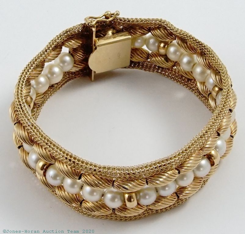 Pearl and 14K yellow gold beaded and mesh bracelet, 27 round saltwater pearls measuring 6mm are strung though the bracelet's center, bracelet measures 7.5 inches in length, an excellent bracelet with tremendous appeal to the lover of pearl and or vintage jewelry. Gross weight 24.1 dwt (37.5 g).