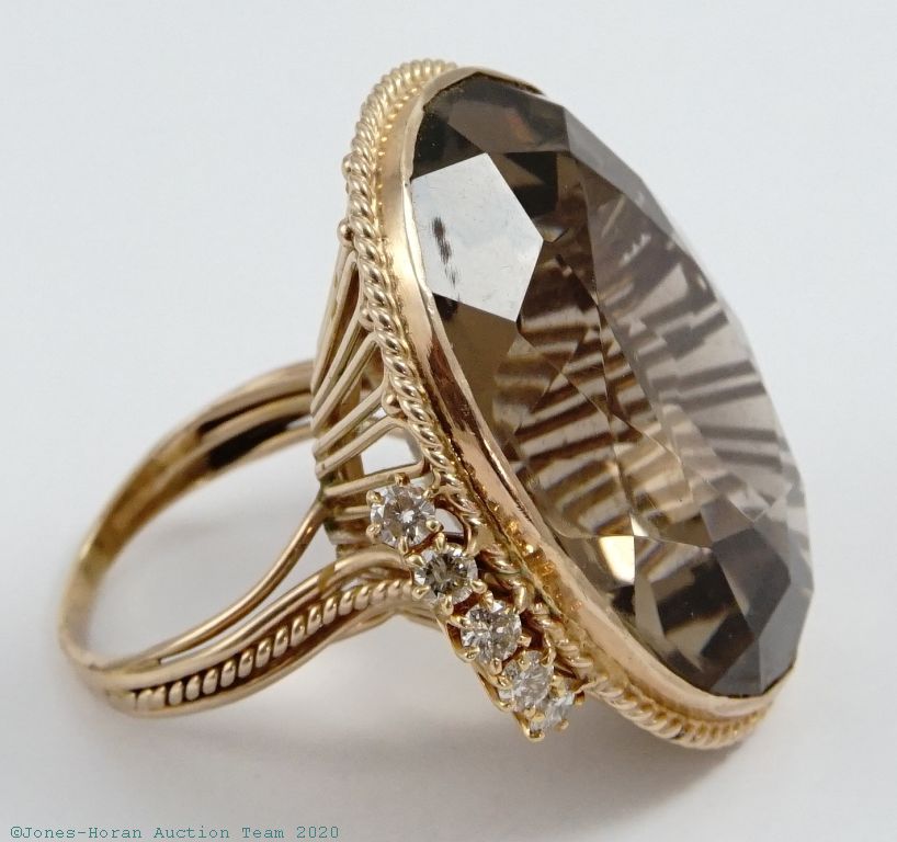 Smoky quartz, diamond and 14K rose gold HUUUGE custom made fashion ring, oval cut smoky quartz center measures 29mm x 36mm, 10 round brilliant cut diamonds set along the sides weigh approximately 1.10 ctw, ring with bezel measures 39mm x 37mm, size 9.25. Gross weight 19.5 dwt (30.4 g). Truly a piece to behold, this was made on custom order through a craftsman in the Jewelers building in Boston during the late 1960s.