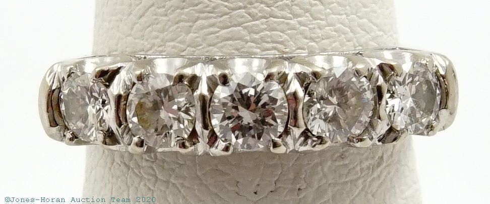 Diamond and 14K white gold band, 5 round brilliant cut diamonds weigh approximately 1.30 ctw, size 6.5, a fabulous ring with very nice quality diamonds of clear appearance and white color, would go nicely with a larger engagement ring of over 1 ct or worn by itself. Gross weight 2.6 dwt (4.0 g).