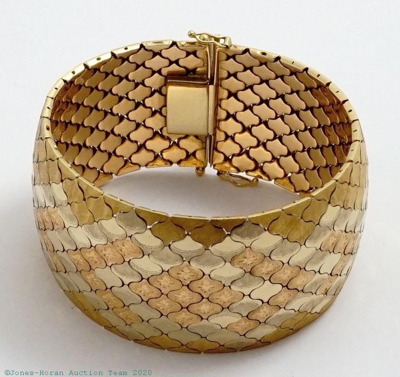 18K white, rose and yellow gold extra wide textured bracelet with box clasp and double safety 8's, bracelet measures 32mm wide and 7.75 inches in overall length, hallmarks from Vicenza, Italy; a fabulously heavy piece with an incredible weight excellent for the gold lover or the person who just likes exquisite craftsmanship. Gross weight 63.9 dwt (99.6 g).