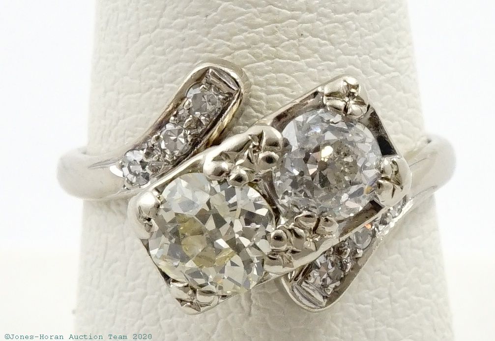 Diamond and 14K white gold antique ring, oval European cut diamond with slight yellowish tint weighs approximately 1.0 ct, round mine cut diamond is considerably whiter in contrast to its counterpart and weighs approximately 0.65 ct, 6 single cut diamonds set along the shoulders weigh approximately 0.09 ctw, size 7, a ring which shows its age but could bring new life to a wonderful vintage inspired piece. Gross weight 2.9 dwt (4.6 g).