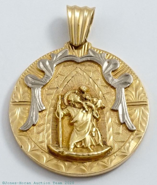 18K white and yellow gold custom made Saint Christopher medallion with raised star of David on rear, pendant measures 39mm x 49mm to top of bail, truly a piece to behold with incredible weight and presence. Gross weight 30.0 dwt (46.7 g).