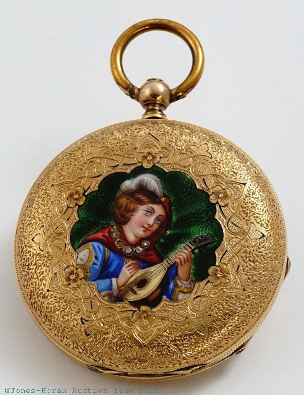 LPW - Emile Jacot, Locle, 41mm, 14K gold original HC with green guilloche enamel and black tracery enamel to front and rear, front with polychrome enamel portrait of a woman playing a lute and wearing a necklace inset with mine cut diamonds, 1882 presentation engraving inside front, signed gold cuvette, white enamel SS dial, KWKS, lever escapement, 15J, gilt mvt, s#92362 within case. Gross weight of assembled watch 29.1 dwt (45.4 g).