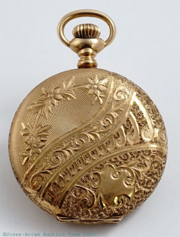 LPW - Waltham, 15J, 0S, 14K gold original HC with beautiful scrolling engraving detail against a vermicelli background, gold cuvette with presentation engraving, white enamel SS dial, SW-SS, nickel damascene, s#12153089. Gross weight of assembled watch 20.8 dwt (32.4 g).
