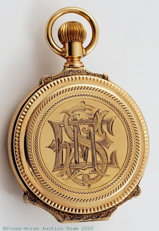 LPW - Waltham, Lady Waltham, 16J, 0S, 14K gold original HC with beautiful engine turning and engraving detail, gold cuvette, white enamel SS dial, SW-SS, nickel damascene, s#15095617. Gross weight of assembled watch 22.1 dwt (34.3 g).