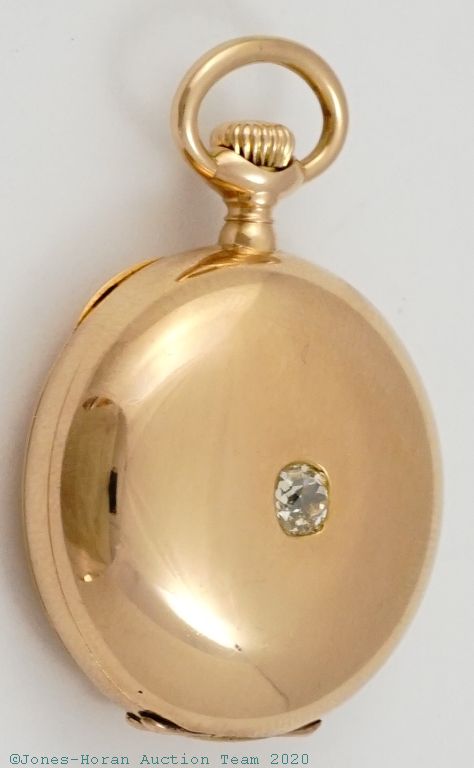 LPW - Tiffany & Co, New York, Swiss made, 31mm, 18K gold original HC with mine cut diamond inset to front that weighs approximately 0.20 ct, initials to rear, gold cuvette, white enamel canister-style (snap on) dial is currently set with pendant at 12 position, SW-SS, lever escapement, 16-17J, fausses-côtes pattern nickel damascene, s#105267 with matching serial number within case. Gross weight of assembled watch 22.6 dwt (35.2 g).
