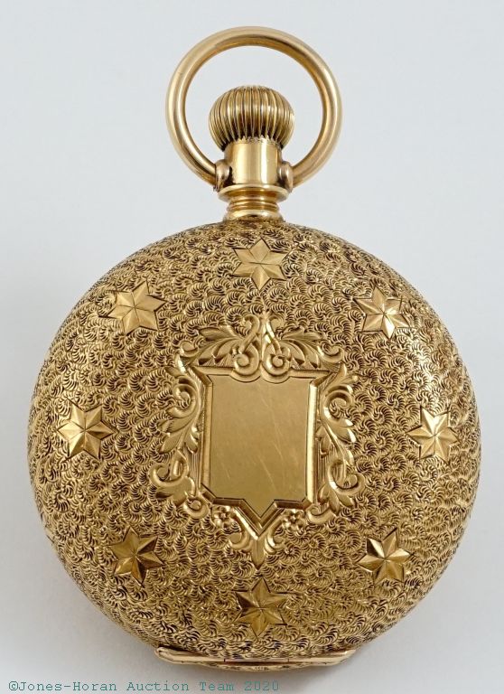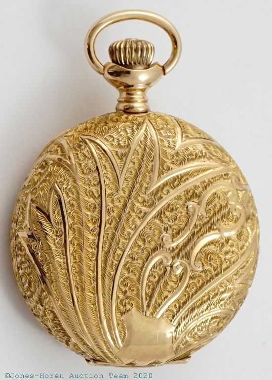 LPW - Elgin, 15J, 6S, heavy 18K gold original HC with beautiful vermicelli and star engraving detail, gold cuvette, white enamel SS dial, SW-LS, nickel damascene, s#1756579. Gross weight of assembled watch 40.1 dwt (62.4 g). A notable beautiful case with superb engraving detail. A beautiful case, with superb crisp engraving detail.