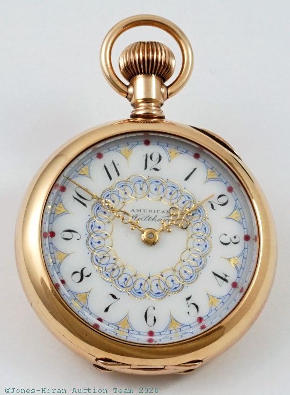 LPW - Waltham, 11J, 6S, 14K gold OF original case, gold cuvette, fancy white enamel dial with ornate blue colored and gold foil decoration to center and minute chapter, red glass insets at 5-minute positions, fancy gilt Louis XV style hands, SW-SS, nickel damascene, s#5430858. Gross weight of assembled watch 32.1 dwt (50.0 g). A spectacular fancy dial in flawless condition, this style without seconds-register is designed to allow this hunting case model movement to orient properly within an open face case.