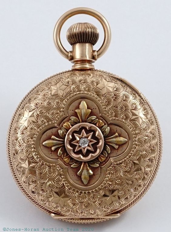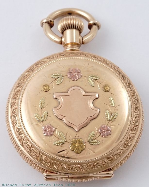 LPW - Elgin, 15J, 6S, 14K multicolor gold "K U" (Keller and Untermeyer) HC recase with multicolor rosette to rear with inset diamond at center, rose gold shield to front with multicolor floral surround, gold cuvette with engraved initials, white enamel SS dial, SW-SS, nickel damascene, s#5351381. Gross weight of assembled watch 38.2 dwt (59.5 g).