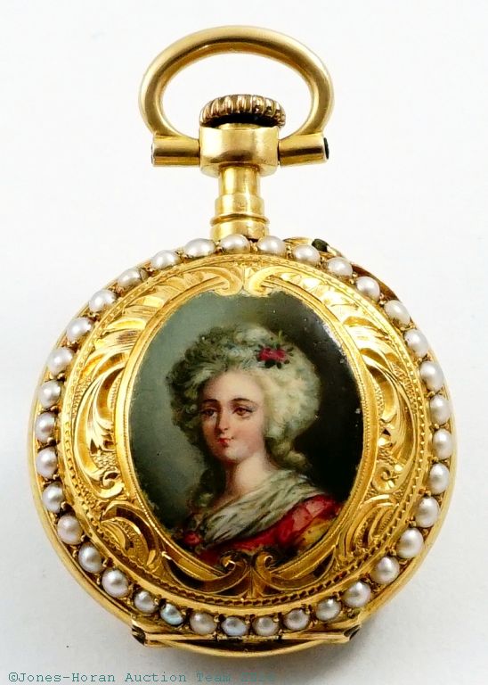 LPW - LeCoultre (unsigned, our attribution), Swiss, miniature ladies' pendant watch, 22mm, 18K gold OF original case with beautiful polychrome enamel portrait of a lady, seed pearls set to bezel and rear perimeter, inner rear with "M G" marking within diamonds for Marcelin Grisel, gold cuvette, fancy white enamel dial with gold foil minute markers, fancy gilt Louis XV style hands, SW-pin-set, cylinder escapement, 12J, fausses-côtes pattern nickel damascene, s#26600 within case. In need of overhaul for movement function, but a particularly beautiful miniature watch of notably small size and with attractive enameled portrait and deep engraving detail.