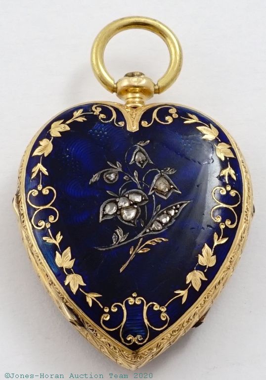 LPW - Unsigned Swiss, gold and enamel heart form pendant watch, 26mm width and widest portion, 31mm height (pendant excluded), 18K gold original HC with split-push to operate spring loaded front and rear lids, front and rear with dark blue guilloche enamel, gold floral detail at perimeter, central front with floral detail having 10 inset diamonds, central rear having bell detail with 11 inset diamonds, gold cuvette with floral engraving at perimeter, white enamel dial surrounded by elegantly engraved floral gold mask, KWKS, cylinder escapement, 10J, gilt mvt, s#9178 within case. Gross weight of assembled watch 12.1 dwt (18.8 g). Comes with a key.