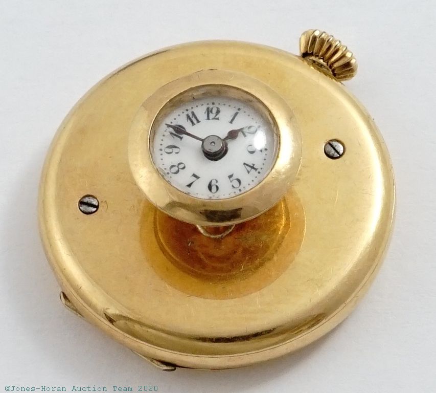 LPW - Vulcain, Swiss, button hole watch, 27mm main case diameter, 13mm upper portion containing dial, 18K gold original case with initials to rear, white enamel dial, SW-SS, lever escapement, likely 15J, fausses-côtes pattern nickel damascene, s#514867 within case. Gross weight of assembled watch 10.5 dwt (16.4 g). Button hole watches are rarely seen in 18K gold.