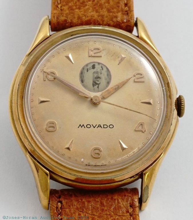 WW - Movado for King Ibn Saud of Saudi Arabia, manual wind, 34mm x 40mm to lug tips, 18mm lug width, original gold-plated base metal case with stainless steel snap back, brown leather strap, original silvered dial that has aged to an attractive cream with applied gold indices, applied image of Ibn Saud at 12, 17J cal 1781, s#260131, triple signed.