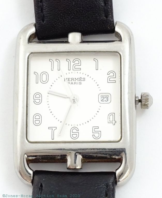 WW - Hermes Paris, quartz, 29mm x 41mm to lug tips, 19mm lug width, original stainless steel snap screwed back case, black leather strap with stainless steel buckle signed Hermes, original white dial with polished silver numerals, date aperture at 3, s#2839742, triple signed. Includes original orange box signed Hermes as well as warranty cards and original sales receipt.
