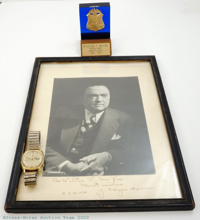 WW - Bulova Accutron, electronically controlled tuning fork, 33mm x 40mm to lug tips, 18mm lug width, original gold-plated base metal case with rolled gold-plate back, missing stainless steel retaining ring, engraved presentation on case back reads "Walt McVee, From FBI - Newark Associates, 3-3-52 To 1-27-78," expandable bracelet, original silvered dial with applied gold indices, day-date aperture at 3, 13J cal 218, s#F502340, triple signed. This watch includes an FBI badge sealed in Lucite with a plaque dedicated to Walter V. McVee as well as a signed photograph of J. Edgar Hoover to Walter dated 1954.