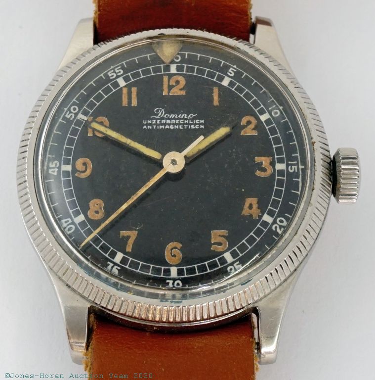WW - Domino Unzerbrechlich Antimagnetisch pilot's watch, manual wind, 36mm x 42mm to lug tips, 19mm fixed lug width, original stainless steel snap back case with knurled bi-directional bezel with radium triangle, brown leather NATO strap, original black dial with radium painted Arabic numerals, appears to be 17J, s#256, triple signed. A highly unusual and early pilot's watch with an excellent look. From the estate of Daniel L. Haff.