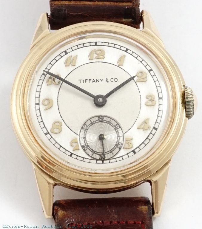 WW - Movado signed Tiffany & Co, manual wind, 30mm x 36mm to lug tips, 16mm lug width, original 14K yellow gold screw back case with faceted lugs, presentation engraved on case back, brown alligator strap with 14K gold buckle, refinished silvered dial with applied gold Breguet numerals, subsidiary seconds at 6, 17J, s#493652, triple signed. Gross weight of assembled 14K yellow gold case without strap 16.6 dwt (25.8 g).