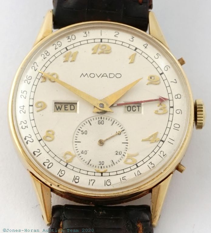 WW - Movado triple calendar, manual wind, 32mm x 39mm to lug tips, 17mm lug width, original 14K yellow gold snap back case with faceted lugs, presentation engraving to caseback, brown alligator strap and 14K gold buckle signed Movado, excellently refinished silvered dial with applied gold Breguet numerals, two inset apertures at 3 and 9 for day and month, date along perimeter, 17J, s#44766, triple signed. Gross weight of assembled watch without strap 19.8 dwt (30.6 g).