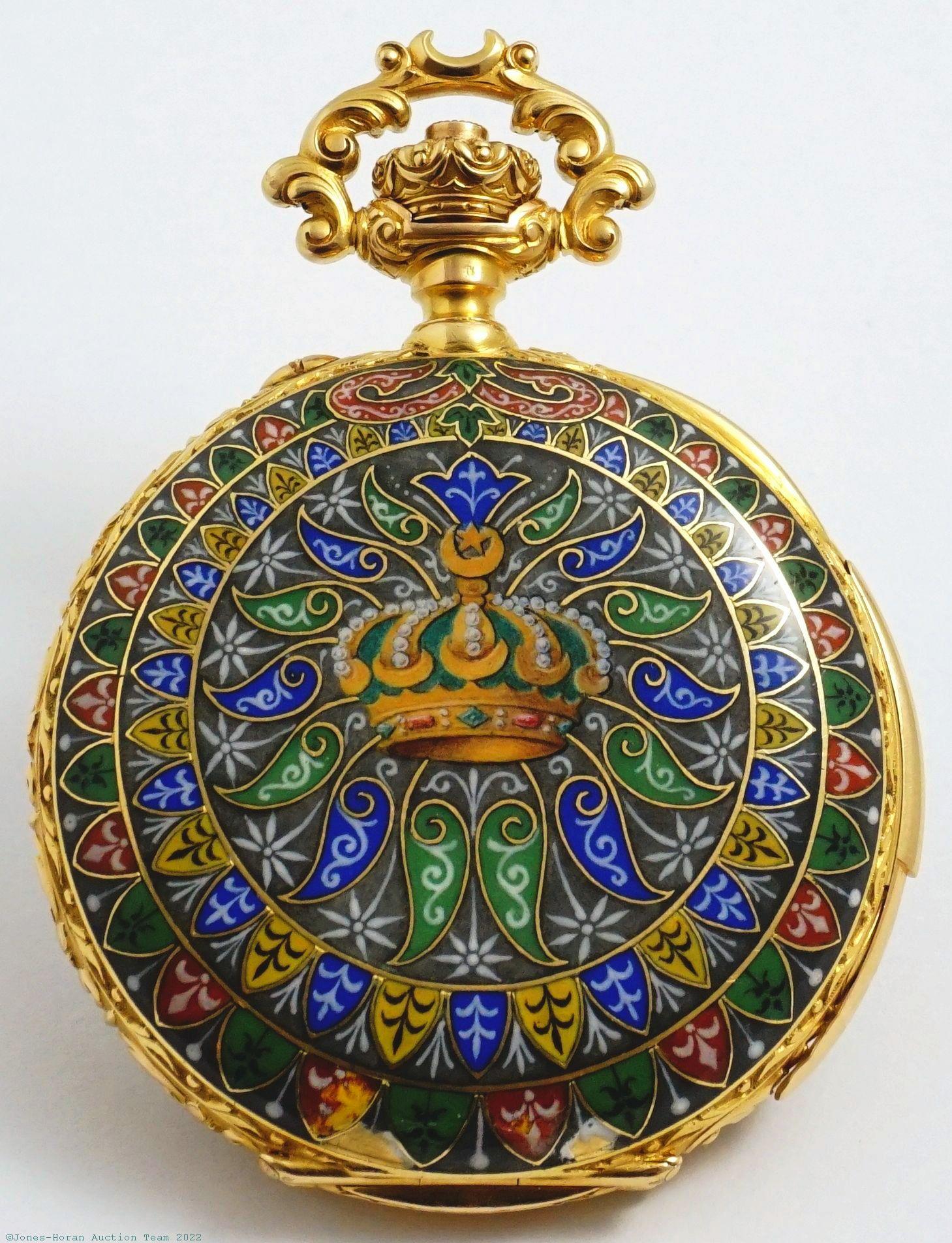 EPW - Charles Oudin, 51 & 52 Palais-Royal, Paris, minute repeater with chronograph and 30-minute register in extraordinary cloisonné case, 51mm, heavy 18K gold OF original case with cloisonné enamel rear featuring an ornate royal crown at center surrounded by ornate polychrome decorative detail, bezel also with cloisonné polychrome enamel detail, band and pendant with ornate deep engraving detail, magnificent ornate bow and crown, signed gold cuvette, white enamel DS dial, SW-pin-set, fully capped lever escapement with counterpoise, likely 38J or greater, balance with white metal (likely palladium) hairspring, fausses-côtes pattern nickel damascene, s#31923. Gross weight of assembled watch 78.5 dwt (122.1 g). An exquisitely beautiful piece that is truly a work of art. The ornate crown image to its case rear suggests the very high likelihood that this masterpiece was unique and bespoke for a member of royalty, and this watch unquestionably ranks as one of the most visually spectacular that our gallery has had the pleasure of handling.
