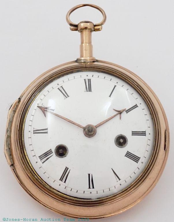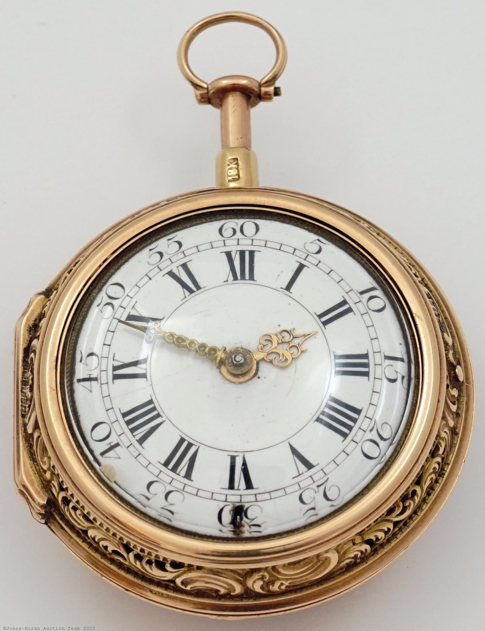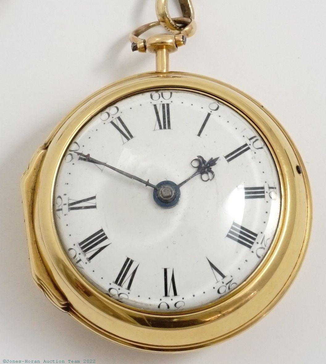 EPW - Samuel Toulmin, London, verge fusee, 45mm, 18K gold or greater (tested) OF original pair cases bearing London hallmarks for 1764, "R.P" marking in cameo for casemaker Richard Palmer I, outer containing partial casepaper for a Cambridgeport, Mass. watchmaker, white enamel dial, KWKS, verge escapement, gilt mvt with pierced and foliate scrolled balance cock, s#2596. Comes with a 6.5 inch gold-filled chain. Gross weight of assembled watch 64.6 dwt (100.4 g).