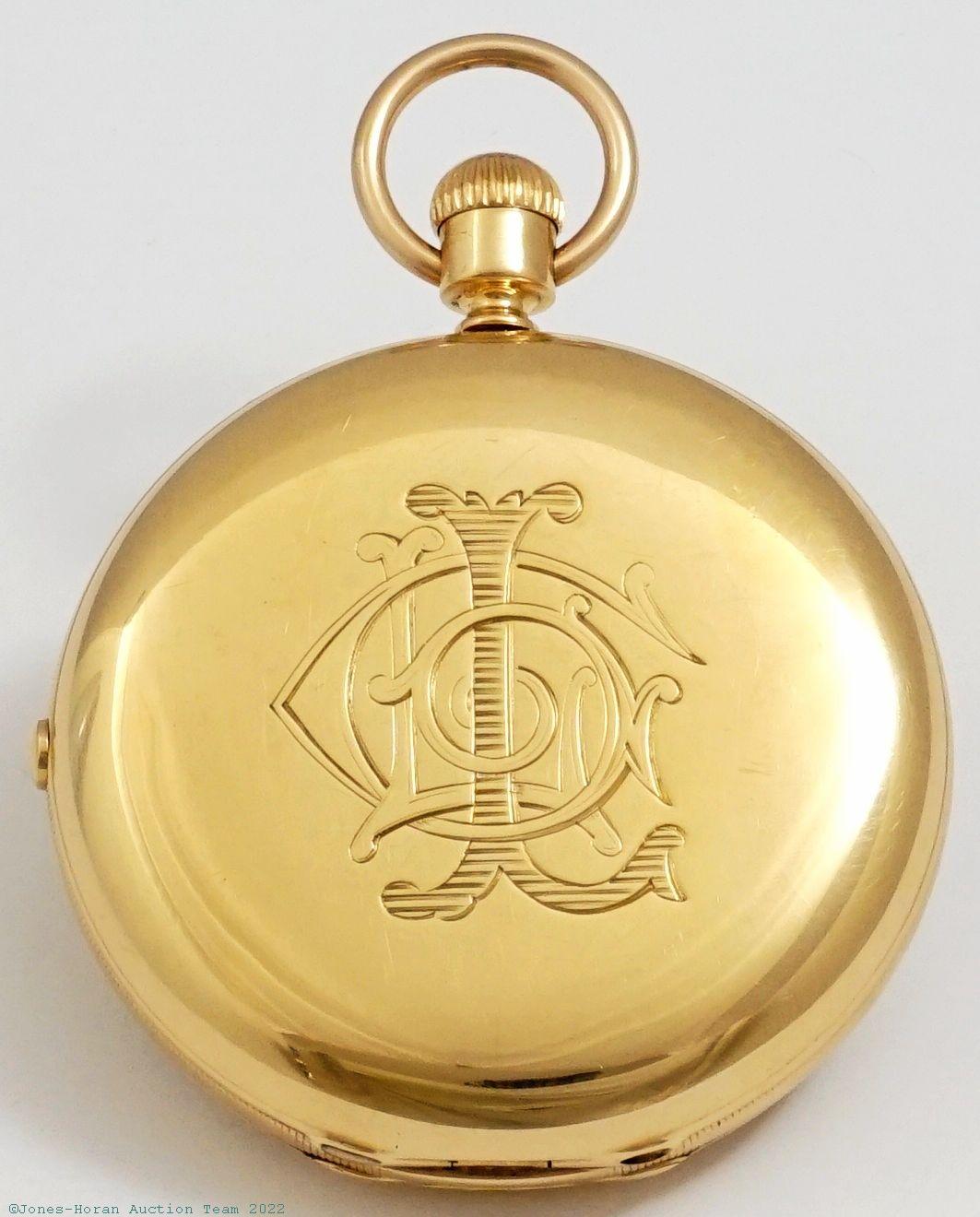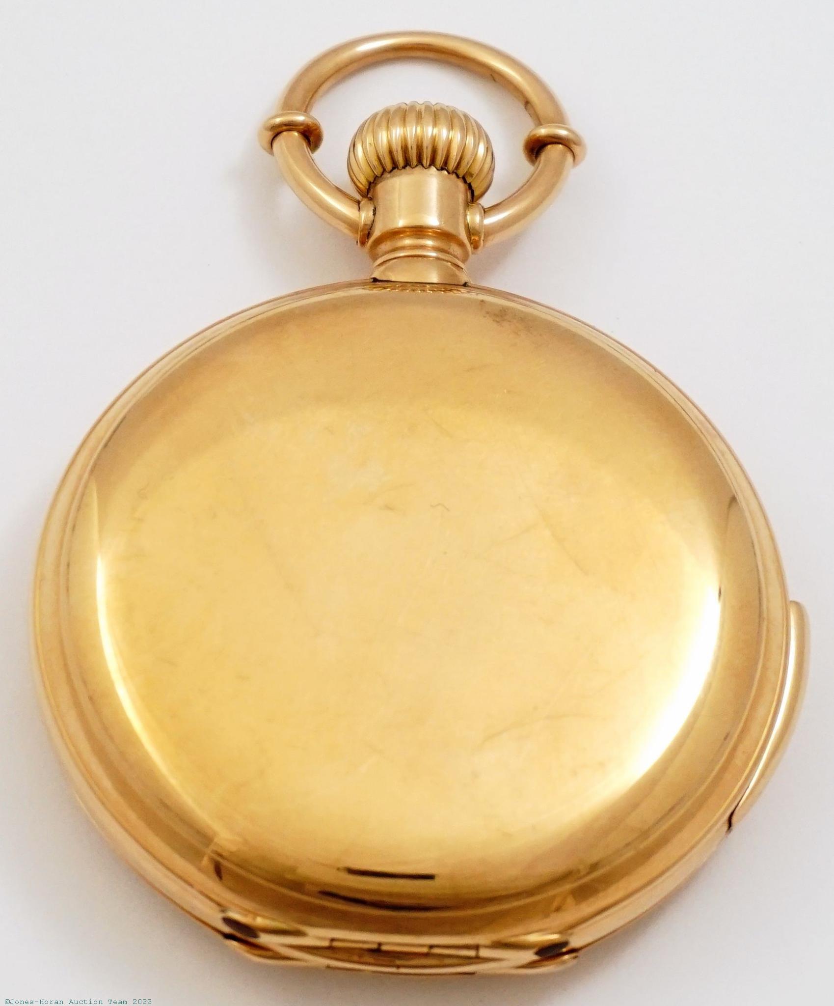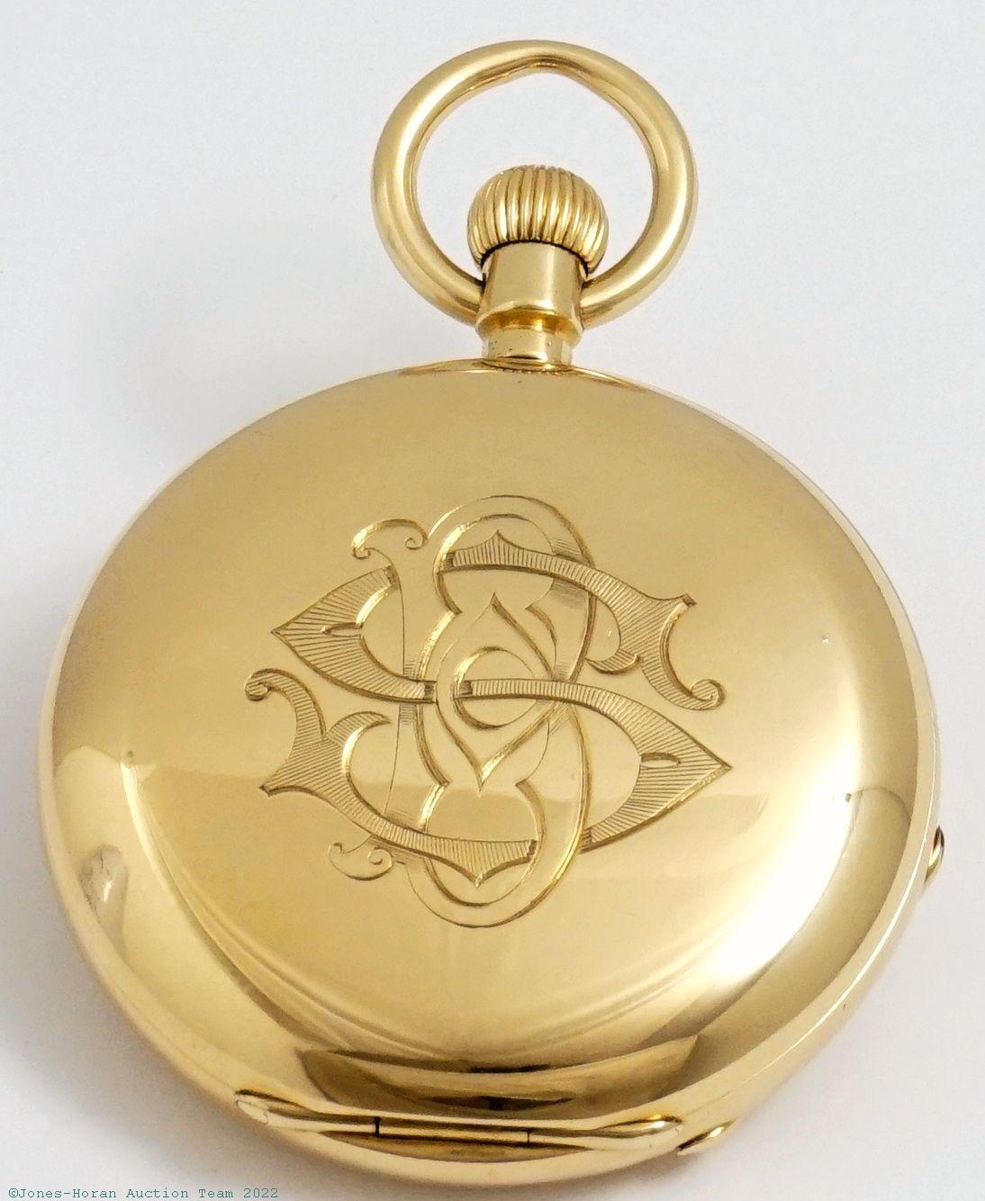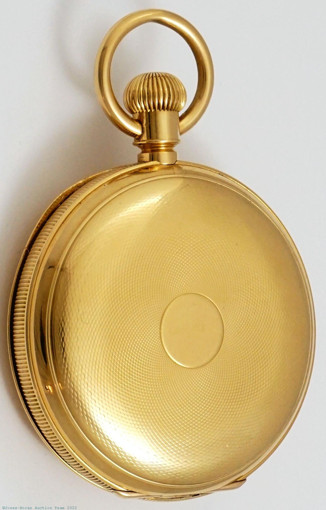 EPW - James Hodell & Co, London, marked to dial, minute repeater pocket chronometer with spring detent escapement, free-sprung balance with helical hairspring, 53mm, massive 18K gold original demi-HC with monogram initials to rear, bearing London hallmarks for 1888, casemaker's "P W" in oval cameo, gold cuvette engraved "Presented to Harry Hunt by his father on his coming of age Oct. 13. 1889.," white enamel SS dial signed "Chronometer by James Hodell & Co. London," SW-pin-set, spring detent escapement with capped escape wheel, free-sprung balance with helical hairspring and diamond endstone, at least 16J, gilt mvt marked for Barnby & Rust of 15 Market Place, Hull, s#16584. Gross weight of assembled watch 101.8 dwt (158.3 g). A magnificent minute repeating pocket chronometer with its very heavy gold case having a commanding in-hand presence.
