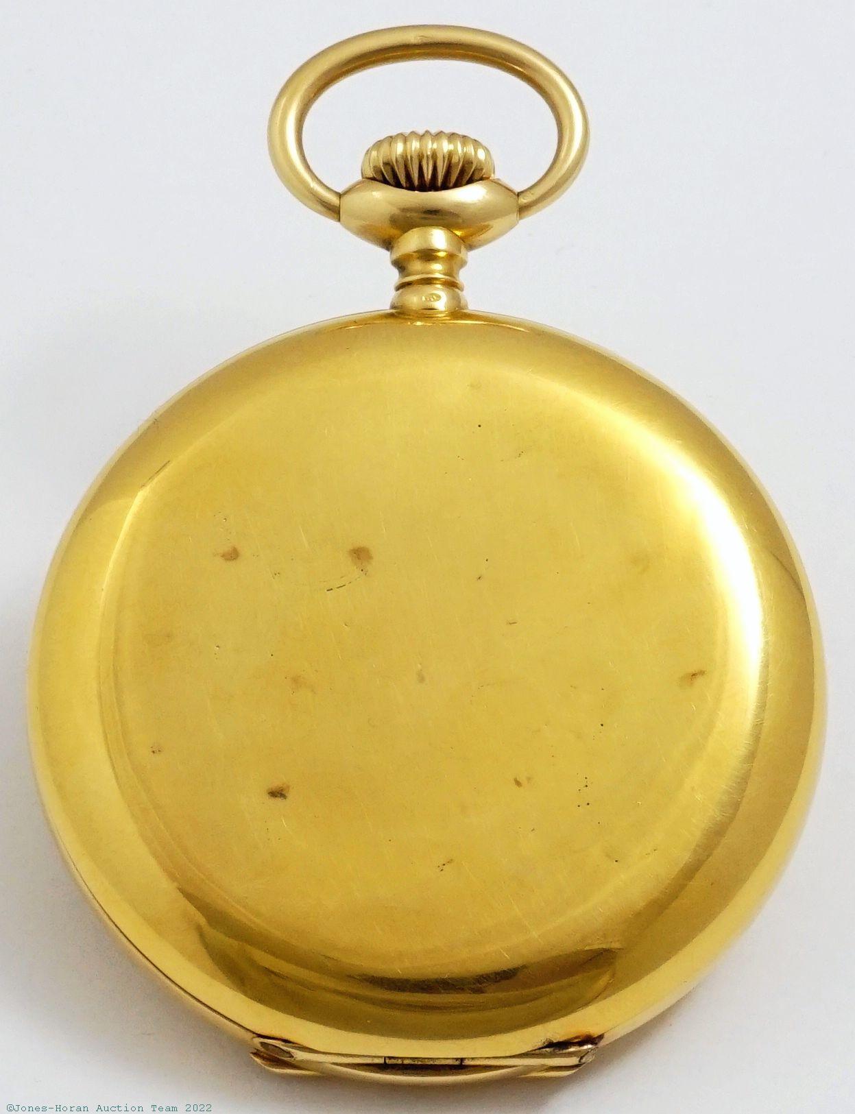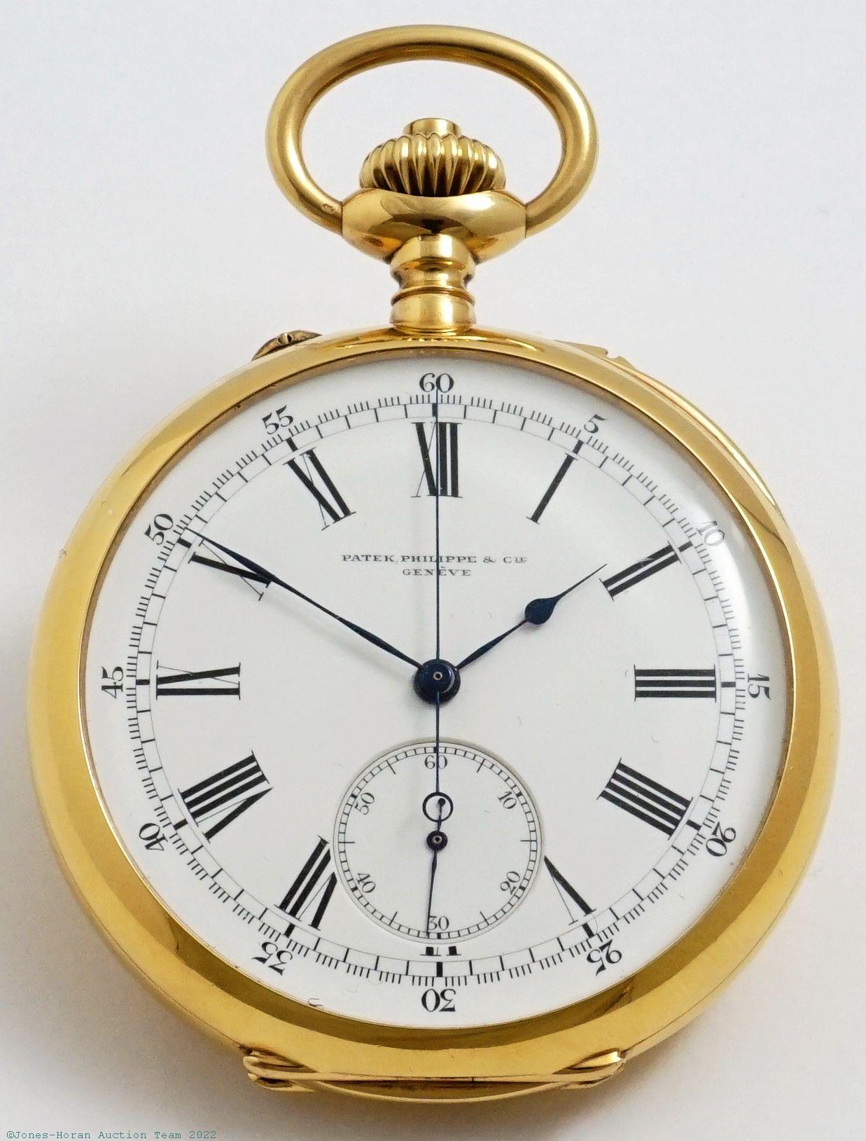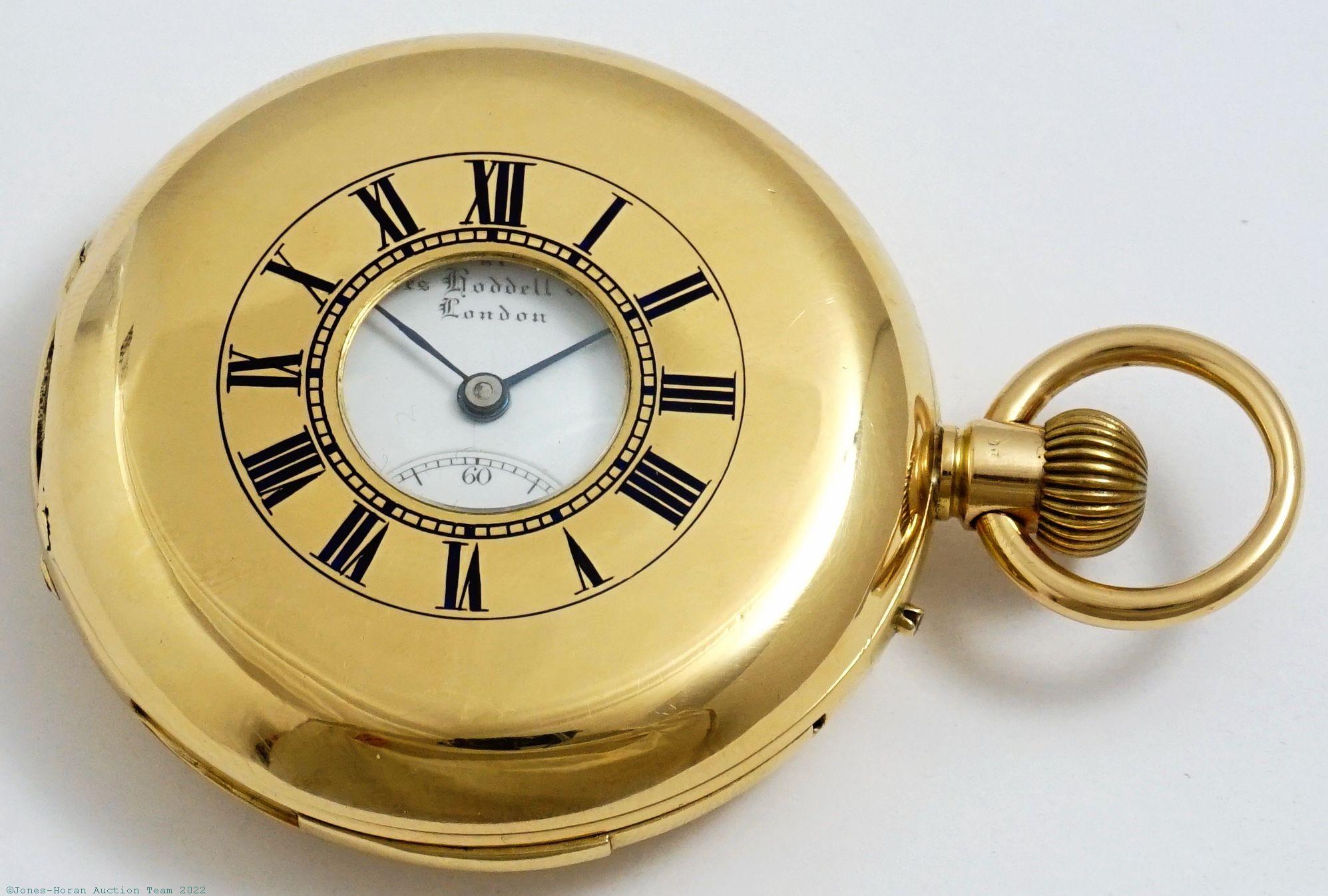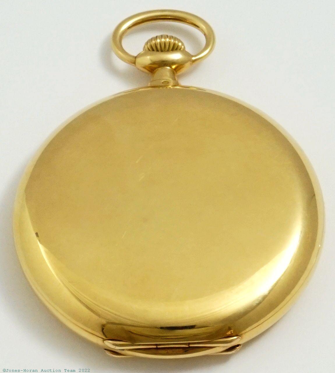 EPW - James Hodell & Co, London, marked to dial, minute repeater pocket chronometer with spring detent escapement, free-sprung balance with helical hairspring, 53mm, massive 18K gold original demi-HC with monogram initials to rear, bearing London hallmarks for 1888, casemaker's "P W" in oval cameo, gold cuvette engraved "Presented to Harry Hunt by his father on his coming of age Oct. 13. 1889.," white enamel SS dial signed "Chronometer by James Hodell & Co. London," SW-pin-set, spring detent escapement with capped escape wheel, free-sprung balance with helical hairspring and diamond endstone, at least 16J, gilt mvt marked for Barnby & Rust of 15 Market Place, Hull, s#16584. Gross weight of assembled watch 101.8 dwt (158.3 g). A magnificent minute repeating pocket chronometer with its very heavy gold case having a commanding in-hand presence.