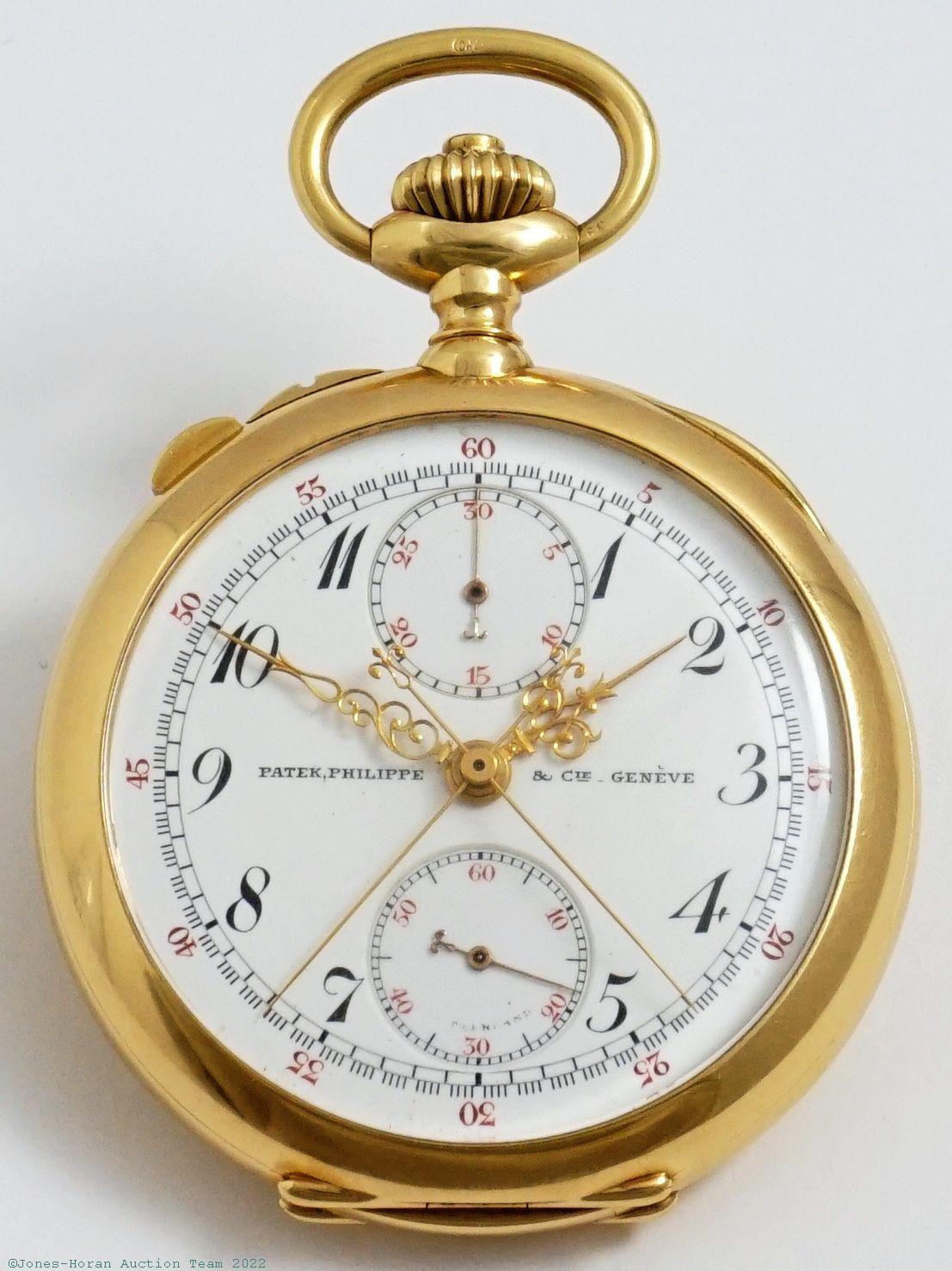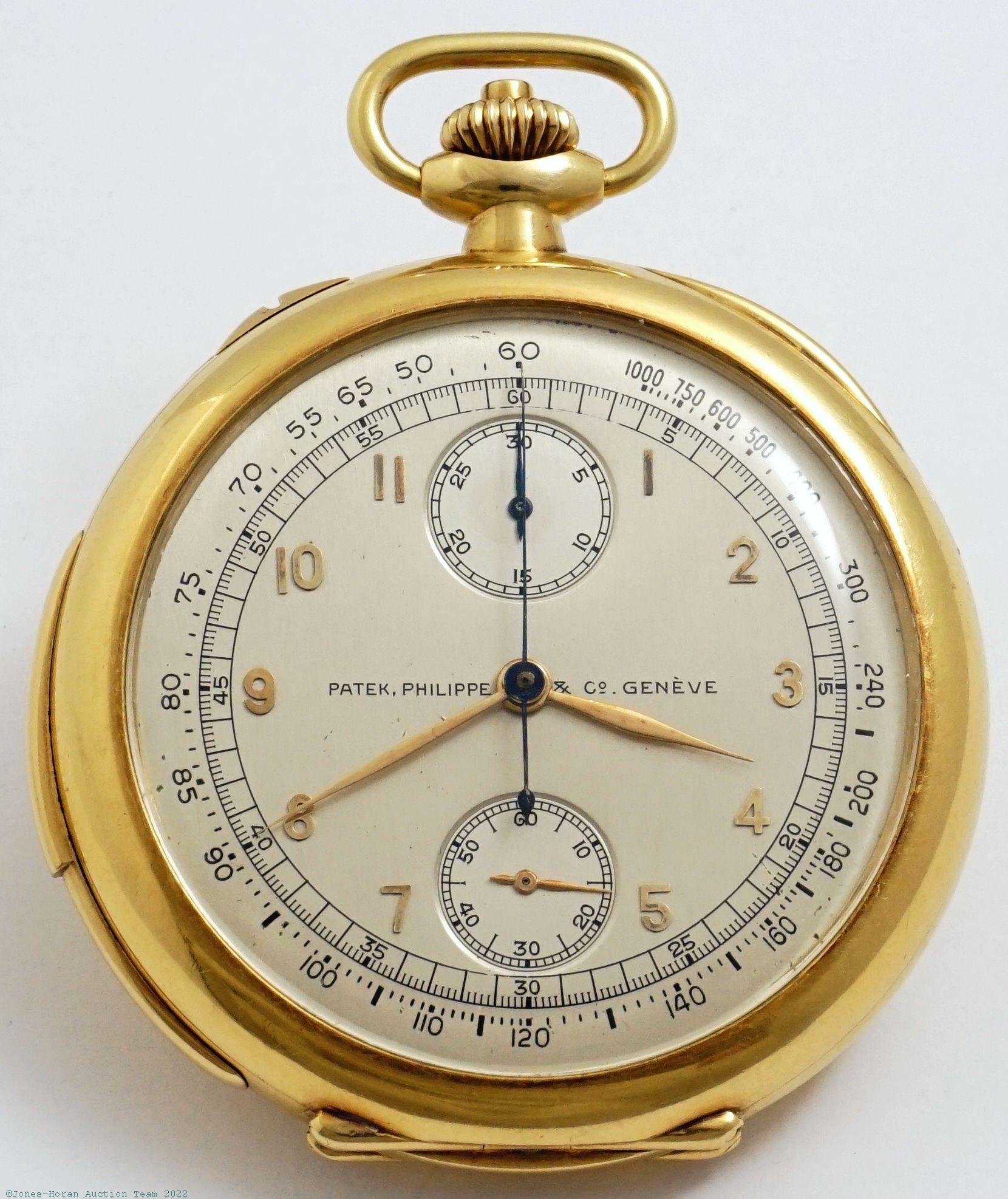 EPW - Patek Philippe, Genève, split-seconds chronograph with 30-minute register, 46mm, 18K gold OF original PP.Co case, gold cuvette with signature ring including marking for retailer Hennegen-Bates Company of Baltimore, white enamel DS dial, fancy gold Louis XV style hands, SW-SS, fully capped lever escapement with counterpoise, 24J, fausses-côtes pattern nickel damascene, s#137896 with matching serial number to cuvette. Gross weight of assembled watch 56.5 dwt (87.9 g). An excellent and very attractive example of this Patek Philippe complication.