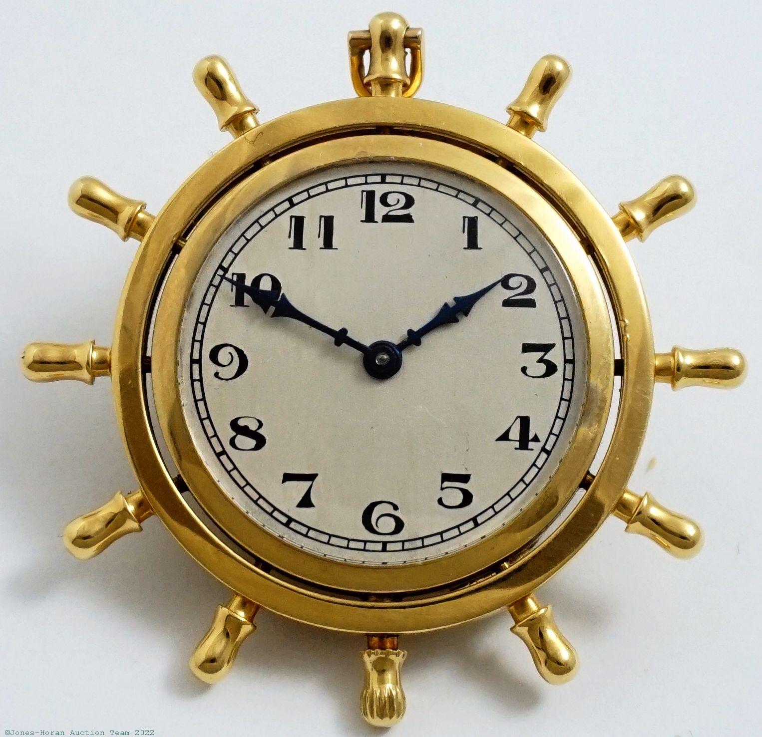 EPW - Zenith, Swiss, ship's wheel form watch, 34mm diameter (excluding wheel points), 46mm wheel point to wheel point, 18K gold OF original case with a pair of nautical flags to rear in blue, red and white enamel, SW-SS via crown at 6, lever escapement with capped escape wheel, fausses-côtes pattern nickel damascene, s#2739570. Gross weight of assembled watch 23.0 dwt (35.8 g).